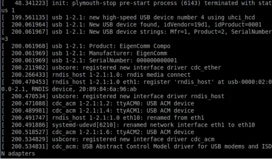 在命令行中执行dmesg命令可能会显示出 rndis_host 1-1:1.0 eth1 这样的日志输出。如果观察不到这些信息,则可能是硬件有问题或者是使用的Linux版本不支持 rndis 功能,请参考相关文档或资料了解详细的驱动配置信息,并按照指导进行相应的设置操作。