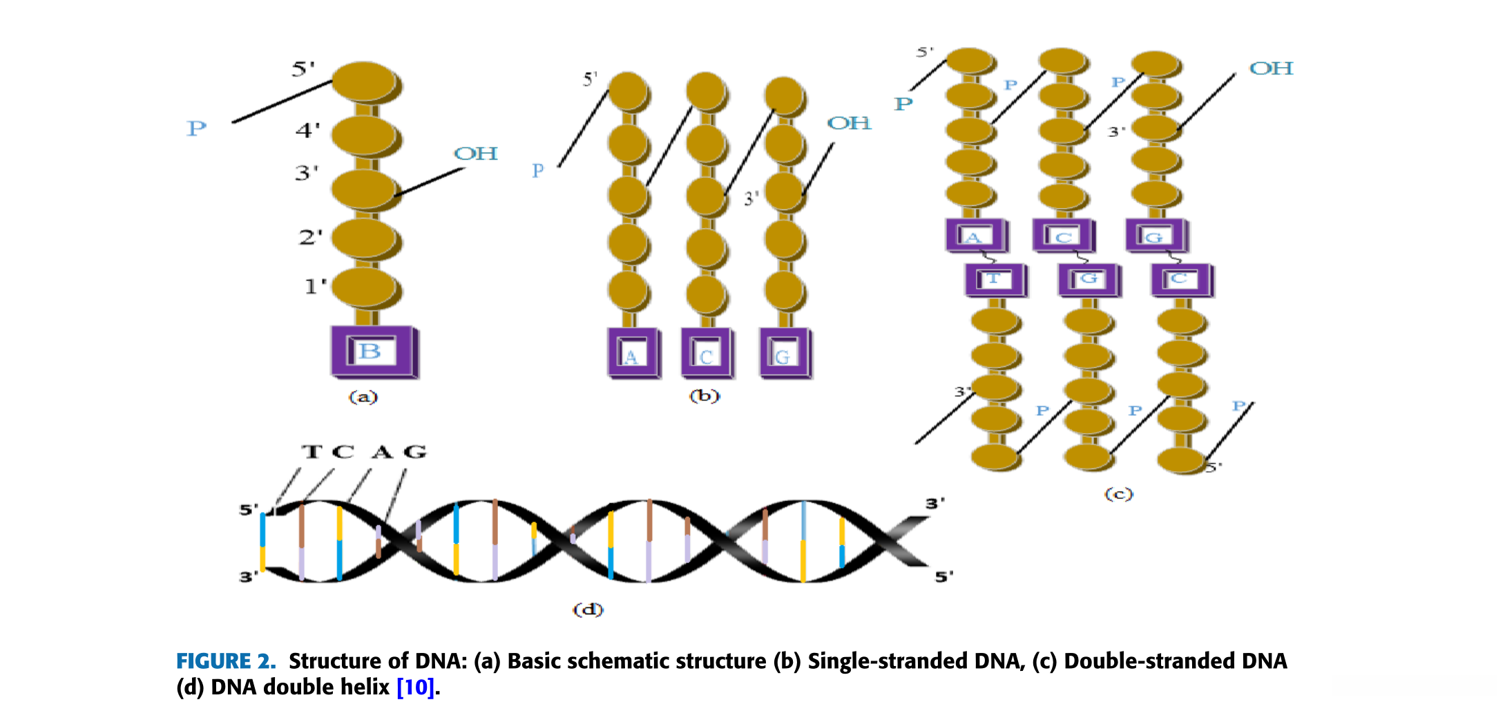 图2代表了基本的DNA结构。图2(a)显示了一个脱氧核苷酸的简单示意结构。