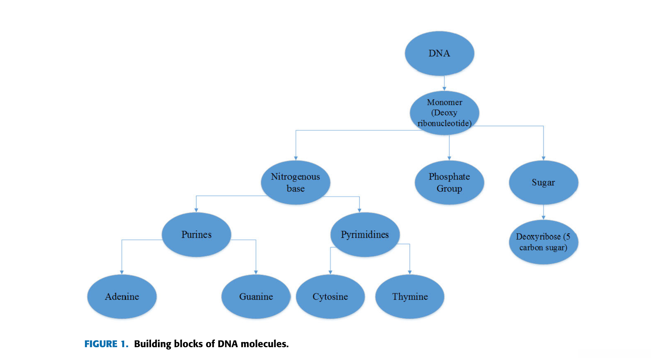 A和G被称作嘌呤类含氮碱基的一种成员;而C和T则属于嘧啶类碱基。在RNA(核糖核酸)以及胞嘧啶中存在尿嘧啶(U)。图1直观展示了DNA的组成模块。