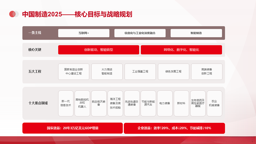该文章阐述了中国制造面临的挑战与未来发展方向。具体而言,在创新乏力、人口红利丧失等传统优势逐步消失的前提下提出了一系列战略目标:即工业4.0与中国制造2025等长期规划。这些战略着重强调了智能制造体系的重要性,并将创新驱动作为核心动力之一;同时提出了网络化、数字化与智能化协同发展的总体方针。在具体实施层面,则明确了国家重点推进高端装备发展、绿色发展转型以及工业基础能力建设等"工业强基"战略;特别提到了智能制造中心建设作为当前工作重点。