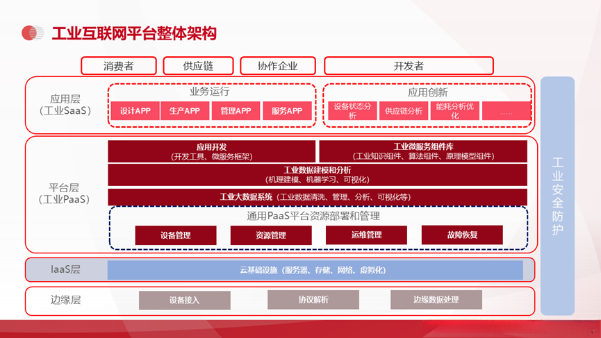 从结构来看, 工业互联网架构由云端基础设施构成, 并包含多个功能模块: 包含IaaS层, 平台层面(即工业PaaS), 应用层面(即工业SaaS)以及边缘架构. 这些部分涵盖了设备接入与管理, 数据采集与传输以及智能化应用开发, 以支持智能制造体系的技术运作.