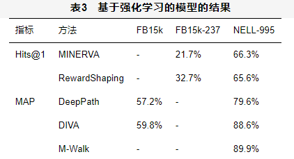 表4展示了基于强化学习的多轮知识问答系统在不同数据集上的实验结果对比分析。其中采用的关键评估指标包括Hits@1和MAP(Mean Average Precision)。值得注意的是,在某些数据集中某些方法的表现可能不如预期理想。