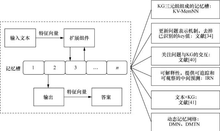 Das R等人在2017年提出了一种创新的研究框架,在构建知识图谱的同时处理文本数据进行多轮问答推理。该研究团队通过将结构化知识图谱与非结构化文本数据映射到同一嵌入空间中进行对齐,在这一过程中取得了显著的效果。相比于单独依赖于知识图谱或文本信息的使用方式,在同一嵌入空间中整合这两者的表现更加卓越。为了提升推理能力,Dynamic Memory Network (DMN)模型采用了门函数机制来控制注意力,而Dynamic Memory Tensor Network (DMTN)模型则引入了神经张量网络以实现更为高效的推理过程,从而实现了比传统方法更好的性能表现。