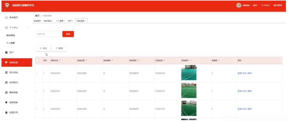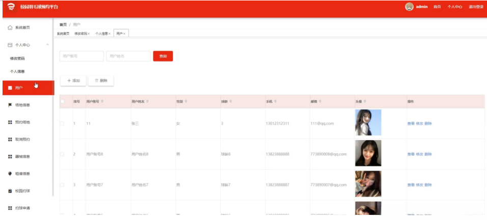 本项目的功能模块开发充分考虑了校园羽毛球预约的具体需求,在确保实际应用效果的基础上完成了主要目标——即提供便捷且高效的在线预约服务。通过引入数字化管理方式,在提升校园体育资源利用率的同时实现了体育文化活动的广泛交流与深入发展。这一系统建设方案的成功实施将显著改善 campus sports activities and support the comprehensive development of campus sports facilities and programs.
