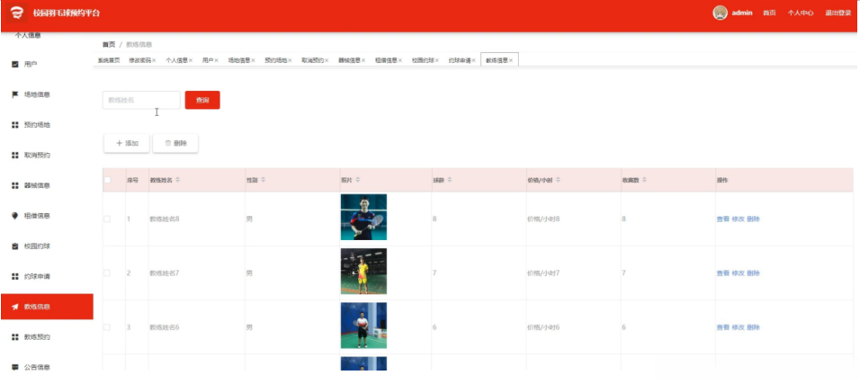 管理员点击进入教练信息页面,在该页面上查看并管理教练姓名、性别、照片资料以及球员职业生涯年限(即球龄)、每小时收费价格(即价格/小时)、粉丝收藏数量等因素,并完成查询操作以及教练信息的增删改查等管理流程。如图5-15所示