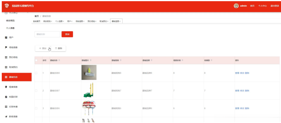 器械借用运营:用户能够进行查询与借用羽毛球类运动器械,并由系统追踪租借信息及相关费用。