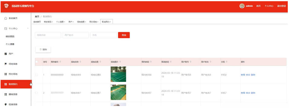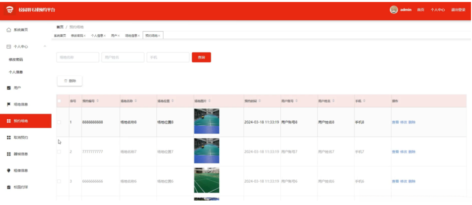 管理员通过平台发起预约操作,在页面详细填写包括预约编号、场地名称及位置信息在内的必要项。随后可执行查询或删除该预约记录的操作。