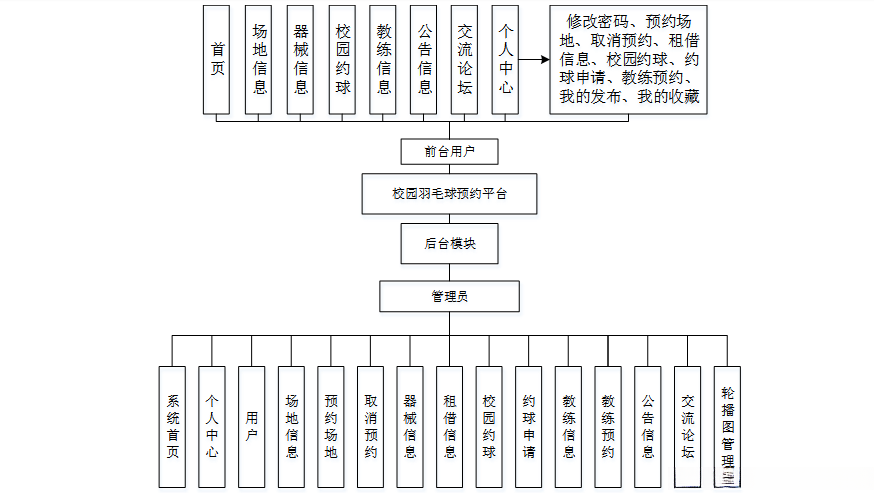 这些功能能够充分满足校园羽毛球预约平台的需求。此系统功能较为全面, 如图所示为系统功能结构图(图4-1)。