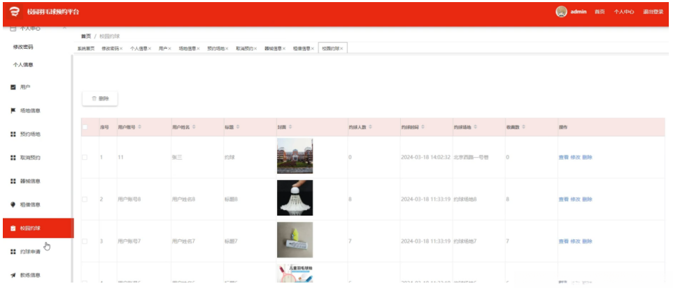 管理员点击校园约球按钮后,在校园约球页面上对用户账号信息、用户姓名记录、标题设置、封面图片上传以及约球参与人数等详细信息字段进行数据整理与编辑,并执行删除校园约球相关信息的操作(如图5-14所示)。