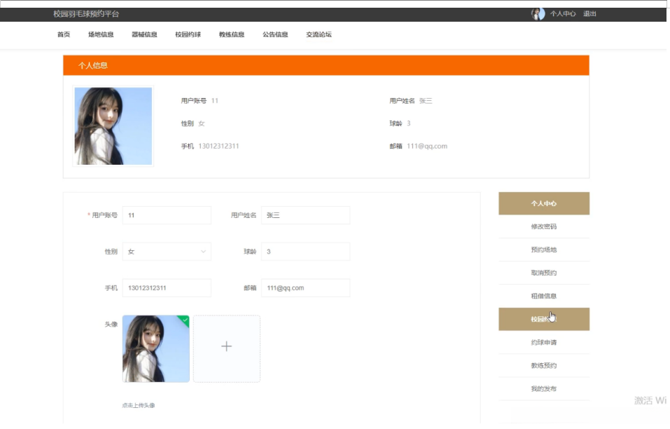 当用户点击进入个人中心页面时,在该页面上支持个人信息的编辑。此外,在此页面中还提供了以下详细操作:包括但不限于修改密码;以及与校园活动相关的各项功能如:预约场地、取消预约、租借信息等;还有与社交相关的功能如:校园约球及相关服务如:约球申请和教练预约等;以及用户的发布内容和收藏记录管理功能等。这些操作均可以通过相应的功能按钮或菜单栏进行完成(如图5-6所示)。