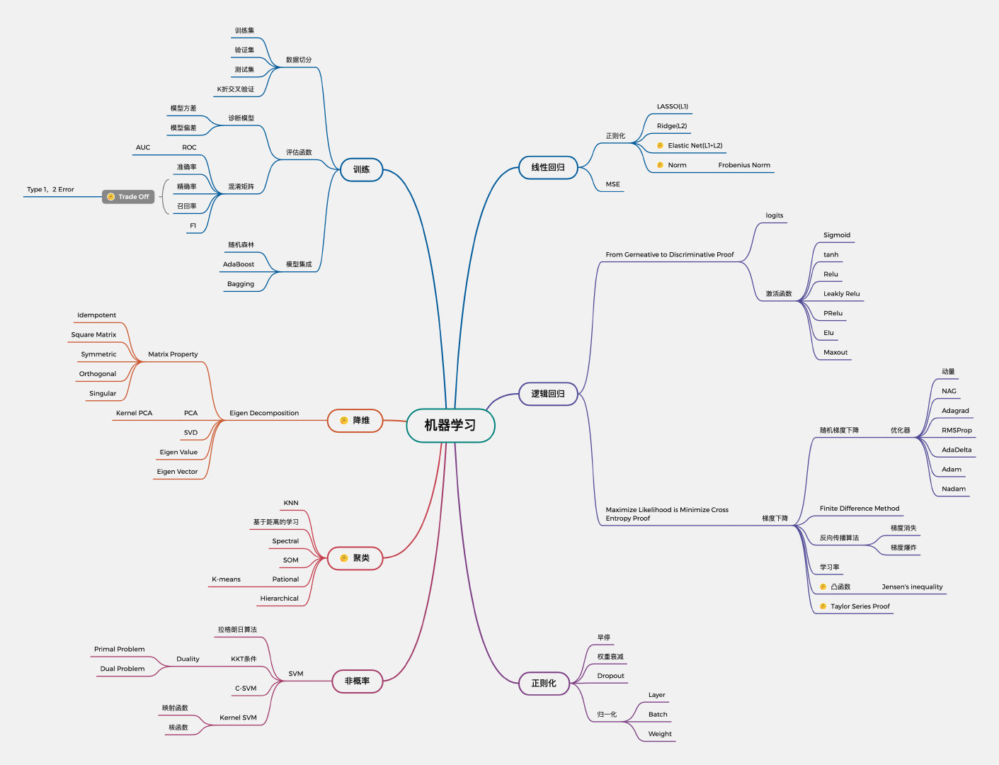 机器学习算法也是NLP的基石,含有许多基础概念,图中分为训练、降维、聚类、非概率、线性回归、逻辑回归、正则化七部分。笔者知识体系在“降维、聚类”存在缺漏,将在后面对该部分内容展开学习。