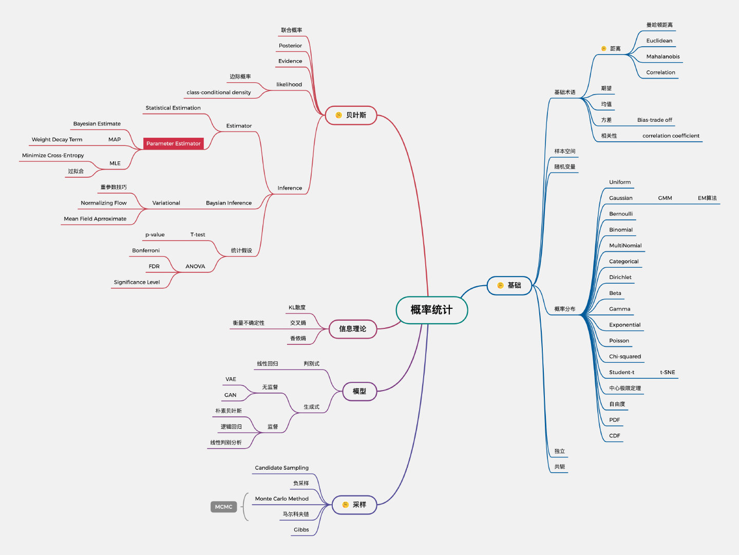 概率统计是人工智能算法的基础,图中分为贝叶斯、信息理论、模型、采样、基础五部分。笔者知识体系在“基础、采样、贝叶斯部分”存在缺漏,将在后面对该部分内容展开学习。
