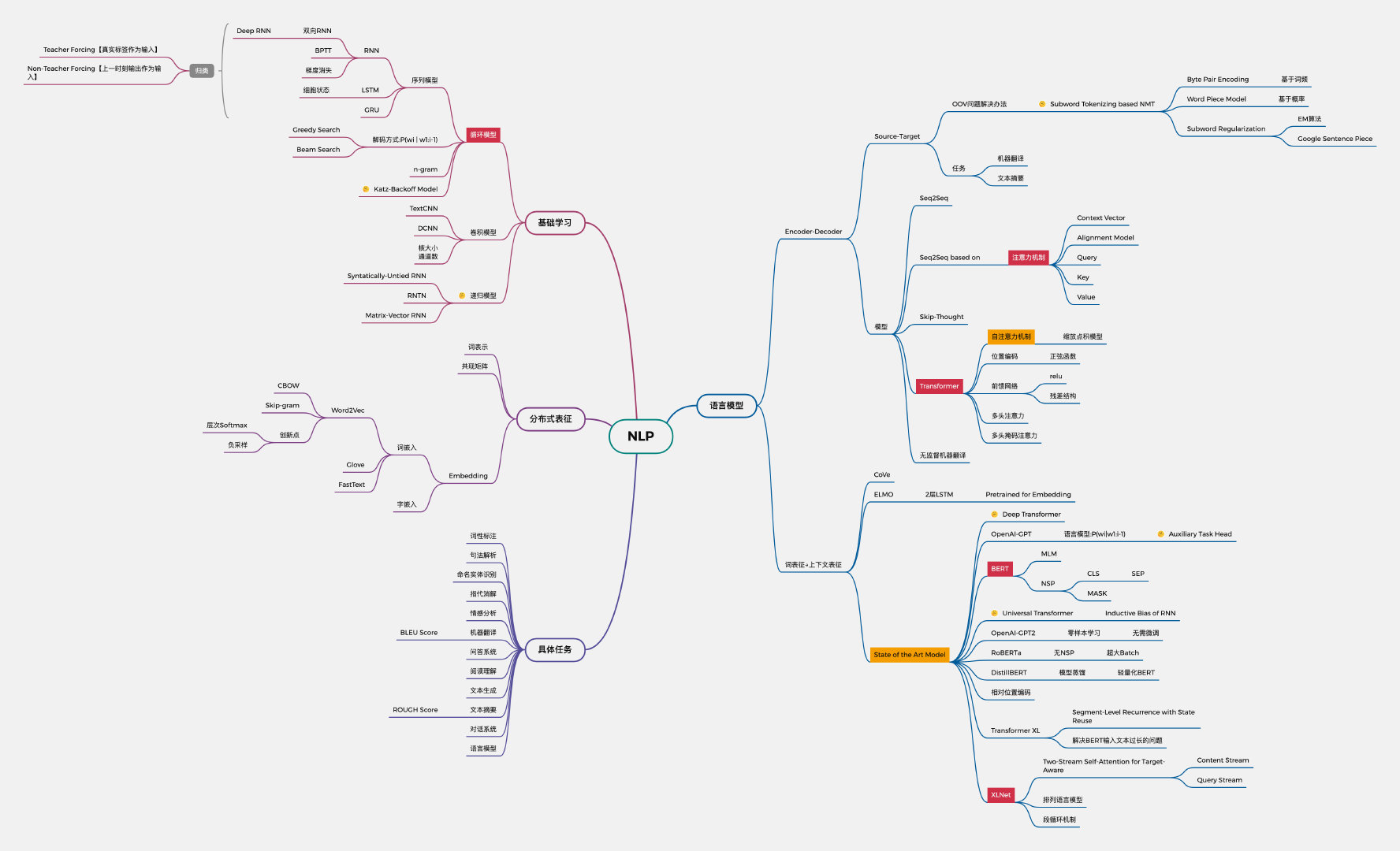 偶然发现一位韩国小哥整理了NLP的学习路线:nlp-roadmap,其中知识点覆盖很全面。由于里面内容都是英文的,笔者重新用xmind绘制学习路线图,并结合自己的理解,将一些名词翻译为中文名词。
