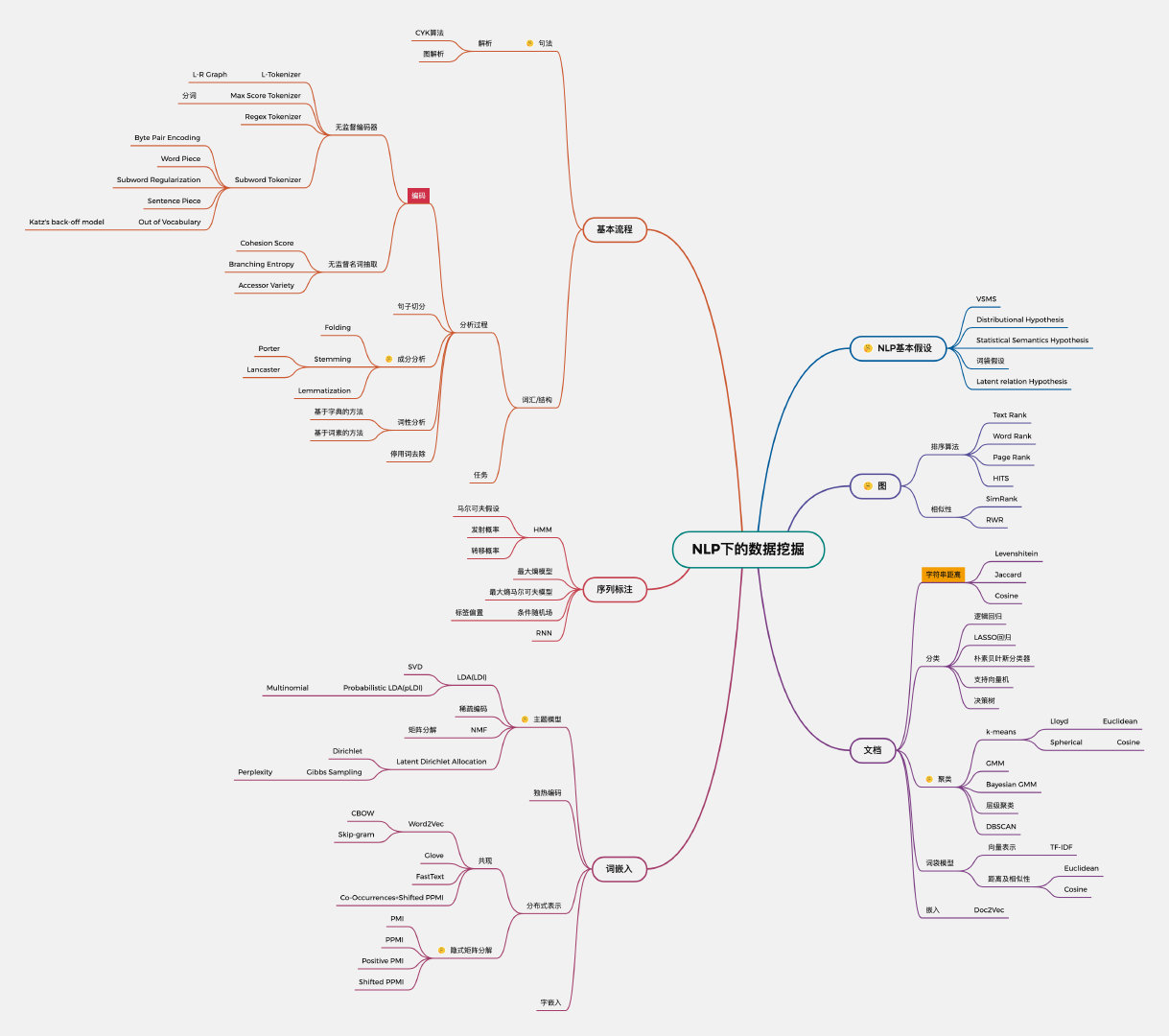 NLP下的数据挖掘包含常见NLP数据处理操作,图中分为基础流程、序列标注、词嵌入、NLP基本假设、图、文档六部分。笔者知识体系在“主题模型、NLP基本假设、图”存在缺漏,将在后面对该部分内容展开学习。