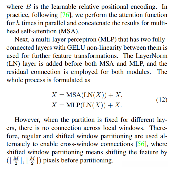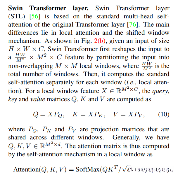 Swin Transformer层(STL)。该层(STL)[56]基于原始Transformer层[76]的标准多头自注意力机制构建而成。其核心特征在于引入了局部注意与窗口机制作为主要区别点。如图2(b)所示,在输入维度为H×W×C的情况下,Swin Transformer首先将输入划分为不重叠的M×M的小块区域进行重构,从而生成了扩展后的HWM₂ × M₂ × C特征空间输入,其中HWM₂代表小块区域总数。随后,该过程分别对每个小块区域计算标准自注意力(即局部关注)。对于单个局部窗口内的特征向量X∈R^{M² × C},其查询、键与值矩阵Q,K,V经计算后分别为
