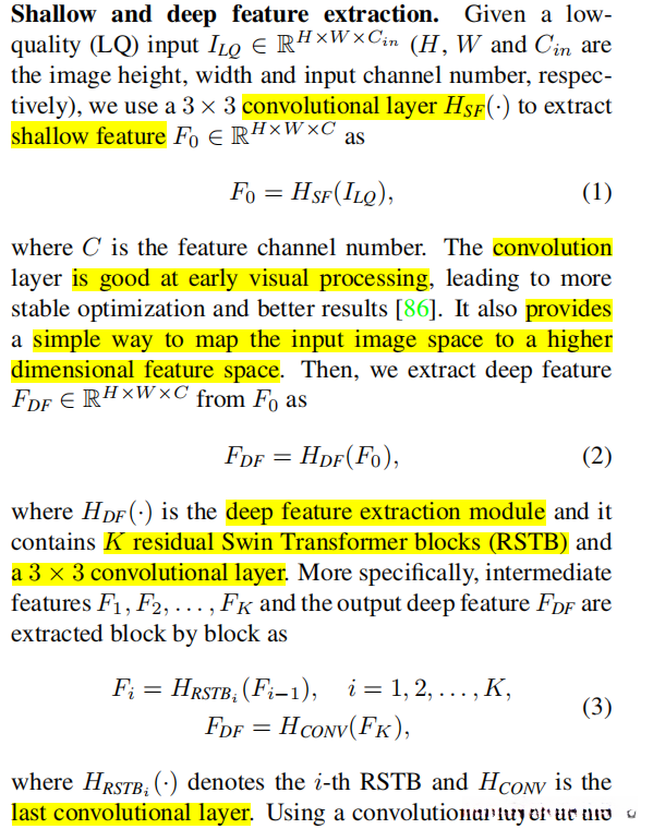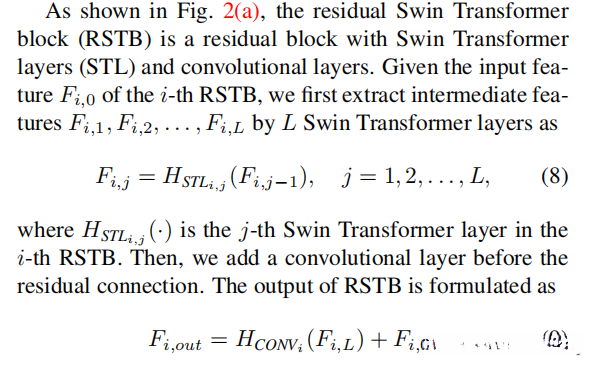 在每个RSTB内部的第i层Swin transformer块中定义了HSTLi,j(·)。接着,在执行剩余连接之前引入一个卷积层以优化网络架构。