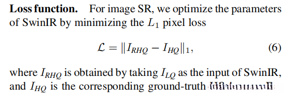 损失函数对于图像SR,我们通过最小化l1像素损失来优化SwinIR的参数