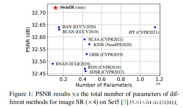 相较于现有基于CNN的图像恢复方法,SwinIR具有显著的优势:在(1)方面,通过分析图像内容与注意力权重之间的互动,可将其理解为空间变化的卷积[13,21,75]。(2)在(2)方面,通过位移窗口机制实现了远程依赖建模。(3)在(3)方面,在保持同样性能的前提下,仅使用更少的参数即可实现更好的性能。如图1所示,与现有的图像SR方法相比,SwinIR以更少的参数实现了更高的PSNR值。