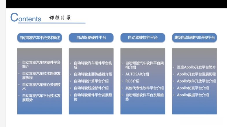 本课程深入介绍了涉及自动驾驶技术开发所需的核心平台体系。主要内容涵盖了:构建自主运算能力所需的硬件平台架构;实现智能化决策支持所需的软件计算框架;以及支撑多场景应用需求的辅助开发平台设计。