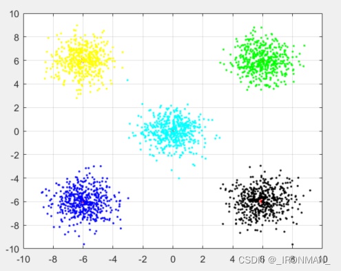图1为算法运行时,数据点被访问的过程图。图2位分类的结果图,可以看到一共有5类数据被准确的分出来。