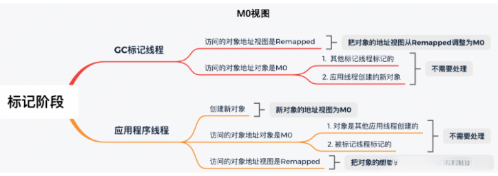 标记阶段全局视图切换为M0视图。由于应用程序与标记线程处于并发执行状态,则可能导致对象的访问可能源自这两个不同的线程之中。