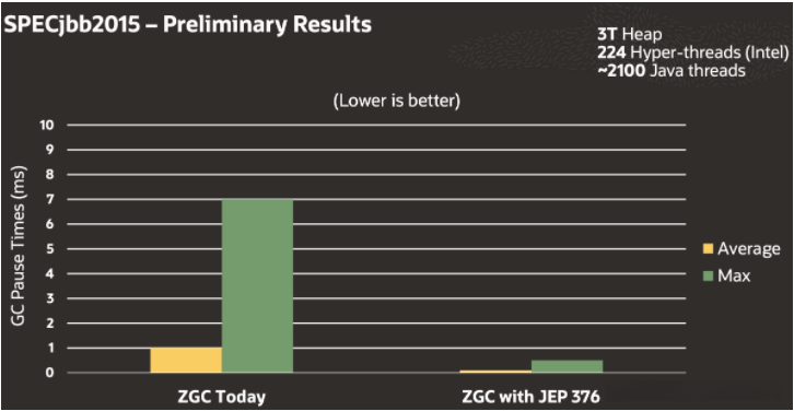 在JDK16发布时,ZGC系统将推出支持并发线程栈扫描的新功能. 基于SPECjbb2015测试数据的结果, 实现该功能后,ZGC的单线程吞吐量能够减少一个数量级. 这将确保ZGC系统在极端负载下的稳定运行, 并使停顿时间降至毫秒级别.