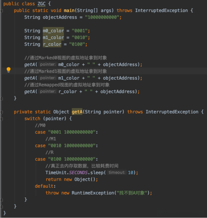 为了能更好的理解ZGC的内存管理,我们先看一下这个例子: