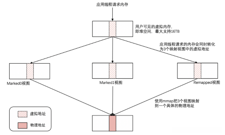 当应用程序创建对象时,在堆内存中分配了一个虚拟地址块,并且ZGC会在Marked0、Marked1和Remapped三个视图空间各自分配对应的虚拟地址块。这些虚拟地址最终都会映射到同一个物理内存位置。