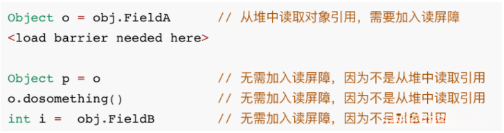 Object o = obj.FieldA // 从堆中读取对象引用,需要加入读屏障