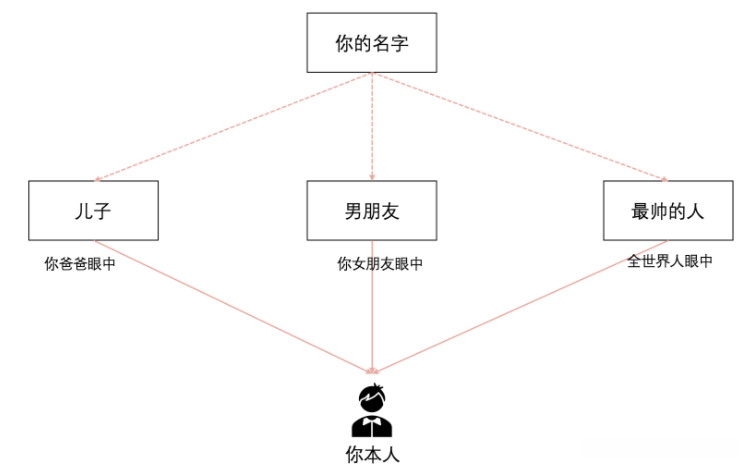 你在父母眼中是一个受爱的人,在伴侣眼中是一个伴侣。在全球人的注视下是最美的存在。您有一个真实身份,请不要对外公开。将这一关系以映射图的形式呈现: