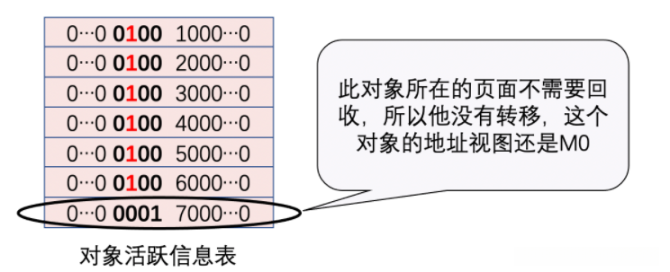 在标记阶段完成后,ZGC将存储所有活跃对象的地址信息于对象活跃信息表中,并确保其对应的地址视图均为M0。