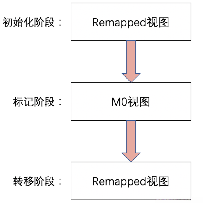 - 标记阶段: 该地址视图在进入标记操作后会转变为Marked0(即M0), 或者转变为Marked1(即M1).