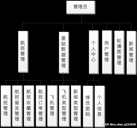 在前面分析的管理员功能的基础上,进行接下来的设计工作,最终展示设计的管理员结构图(见下图)。管理员管理飞机,管理用户,管理航班,管理新闻,回复用户留言,查看航班订单。