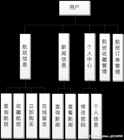 在前面分析的用户功能的基础上,进行接下来的设计工作,最终展示设计的用户结构图(见下图)。用户查询航班,收藏航班,购买机票,查看航班订单以及新闻信息。