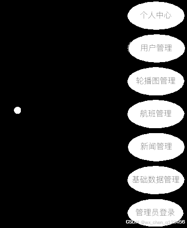 航班订票管理系统经过分析,确定了其需要设置管理员的角色,其操作的功能通过用例图展示(见下图)。管理员管理飞机,管理用户,管理航班,管理新闻,回复用户留言,查看航班订单。