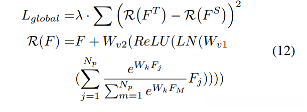 在图像处理领域中,不同像素之间的关系往往包含丰富的知识资源,并且这些信息有助于提升检测性能。在3.1节中介绍了一种基于局部蒸馏的方法用于分离前景与背景的关系。然而,在这一方法中存在一定的局限性:它无法有效捕捉不同像素之间的全局关联性。为此我们提出了一种全新的全局提取方法:通过从特征图中提取不同像素之间的全局关系,并将其从教师蒸馏模型传递到学生网络中进行学习