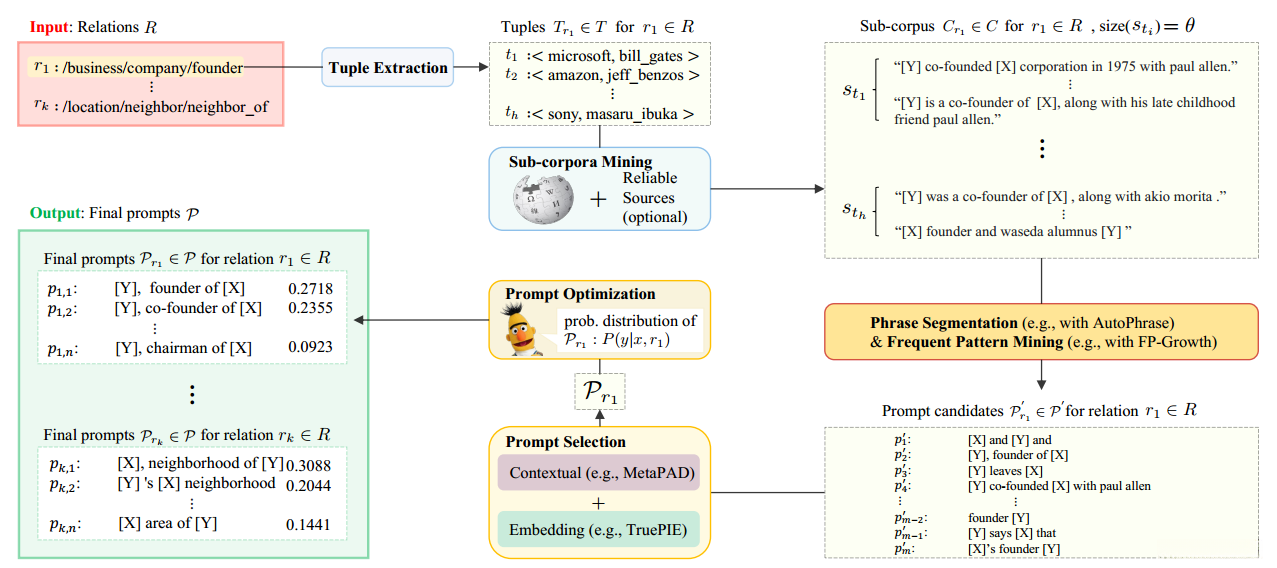 在处理复杂的关系网络时,在缺乏专业知识的情况下进行人工设计会导致高昂的成本投入;而且无法保证工作进度的有效推进;因此吸引了研究者的关注。Jiang等人于2020年开发了一种名为MINE的方法;该系统能够在大规模文本数据库(如维基百科)中寻找输入与输出之间的中间节点或依赖关系;他们还提出了一个创新性的方案;通过评估个体在生成模型(PLM)上的表现来提升提示集的质量;在此前基于现有技术阶段的研究条件下;文本模式挖掘承担了类似功能;即为信息提取提供可靠的分析模型基础;例如MetaPAD(Jiang等人, 2017)通过引入模式质量函数的概念实现了上下文感知的分割机制;从而构建了高精度的模式模型;而TruePIE(Li等人, 2018)则提出了构建了新的分析框架的概念