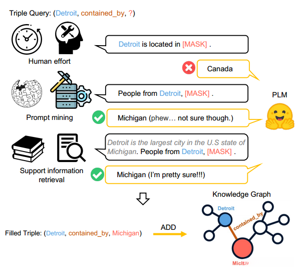 预训练语言模型(PLMs)(由Devlin等人于2019年提出;Liu等人于2019年首次提出)在从大量未标注数据中自主学习并潜移默化地积累事实知识方面展现出卓越的能力(Petroni等人于2019年)。借助这些技术,在处理和整合外部文本信息时可有效辅助构建知识图谱体系。近年来 emerged的新颖知识图谱补全方法(Shin et al., 2020; Lv等人, 2022)主要依赖于人工生成的提示(例如,在图1中提及"Detroit is located in [MASK]"),以便通过机器学习系统检索与填充缺失信息(例如,在这种情况下系统会返回"Michigan")。然而,人工生成提示不仅存在成本高昂的问题而且效果有限(例如,该系统对带有人工生成提示的查询返回了错误的答案如"Canada"等结果),如图1所示。