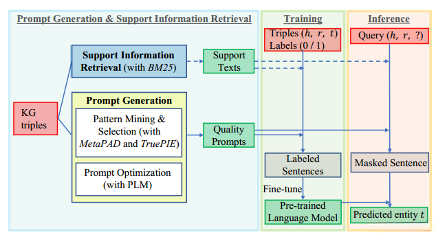 LAMA(Petroni等人,在2019a年)最初是从PLM中研究知识框架。这些提示信息通过使用主题占位符和对象未填空的位置进行手动创建。例如,在一个三重查询(如Miami, location, ?)的情况下,“Miami is located in [MASK]”就是一个可能的提示。训练目标是通过PLM精准预测并填充[MASK]位置的信息。另一种方法是由BertNet团队提出的(Hao等人,在2022年),他们通过应用GPT-3(由Brown等人在2020年开发)的方法来生成包含输入实体对和人工种子提示的加权提示集合。随后系统再次利用PLM进行搜索,并选择集成顶级实体对以完成知识图谱(Knowledge Graph, KG)补全过程。