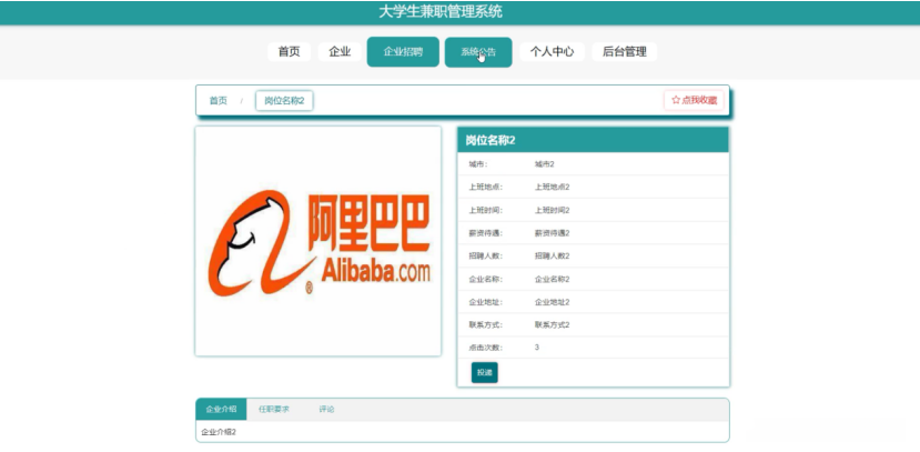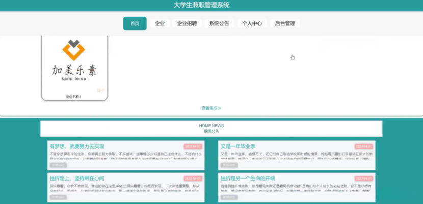 大学生兼职管理系统,在系统首页可以查看首页,企业,企业招聘,系统公告,个人中心,后台管理等内容,并进行详细操作;如图5-1所示。