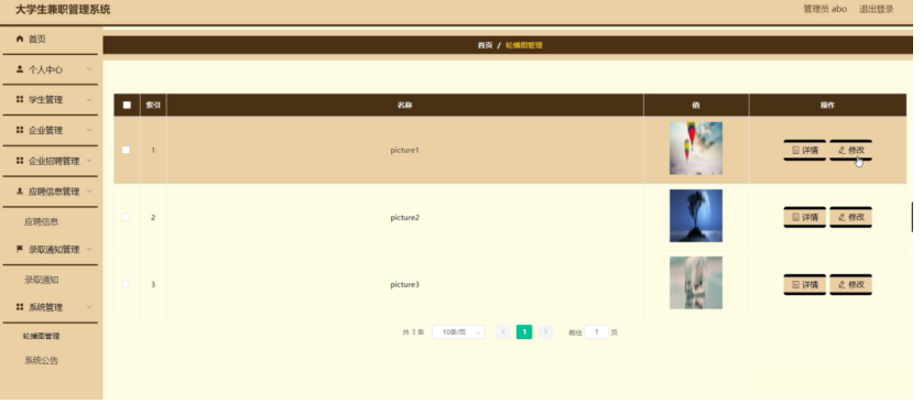 系统管理;在轮播图管理页面中可以查看索引,名称,值等内容,并进行详情,修改操作;还可以对系统公告做详细操作,如图5-10所示。