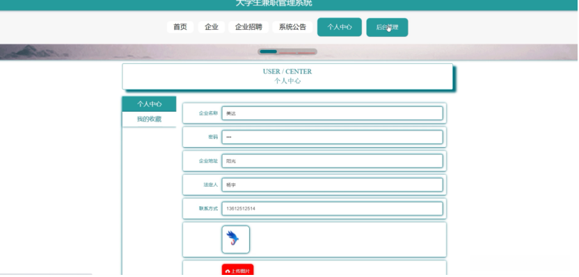 个人中心,在企业的个人中心页面通过填写企业名称,密码,企业地址,法定人,联系方式,上传图片,企业邮箱等内容进行更新信息,还可以根据需要对我的收藏进行相对应操作,如图5-5所示。