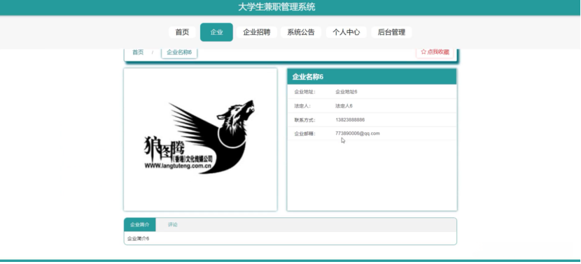 企业,在企业页面可以查看企业名称,企业地址,法定人,;联系方式,企业邮箱等内容,并进行评论,点我收藏操作;如图5-4所示。