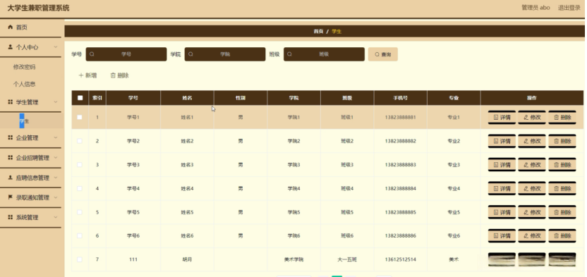 学生管理;在学生管理页面中可以查看索引,学号,姓名,性别,学员,班级,手机号,专业等内容,并进行详情,修改和删除等操作;如图5-7所示。