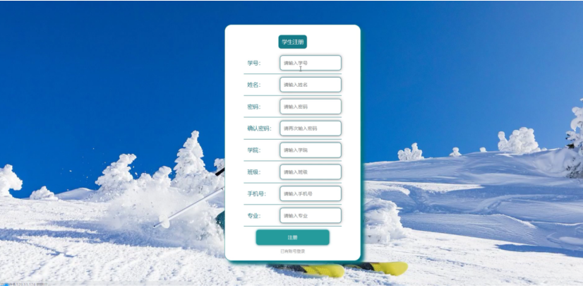 学生注册,在学生注册页面通过填写学号,姓名,密码,确认密码,学院,班级,手机号,专业等信息进行注册操作,如图5-2所示。