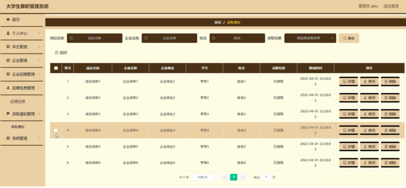 录取通知管理;在录取通知管理页面中可以查看索引,岗位名称,企业名称,企业地址,学号,姓名,录取结果,通知时间等内容,并进行详情,修改,删除操作;如图5-9所示。