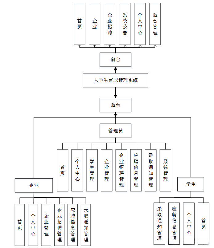 通过市场调研及咨询研究,了解了大学生兼职管理系统及管理者的使用需求,于是制定了管理员,学生管理和用户等模块。功能结构图如下所示: