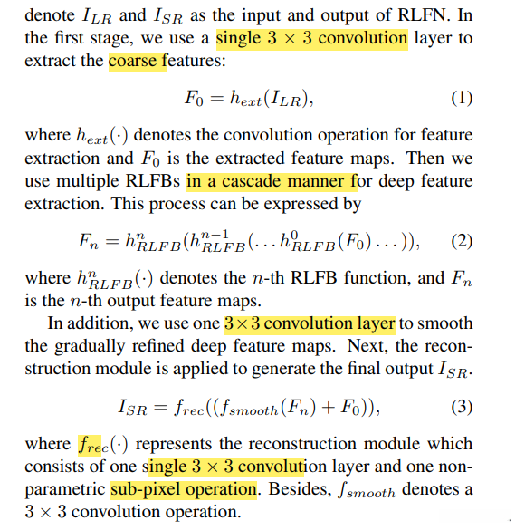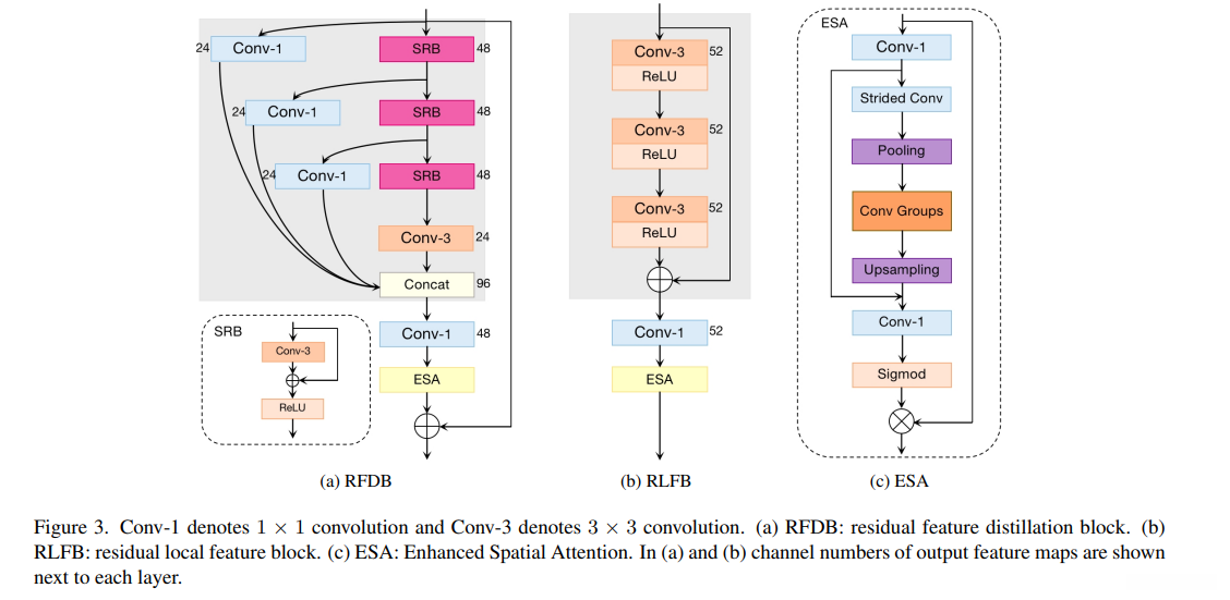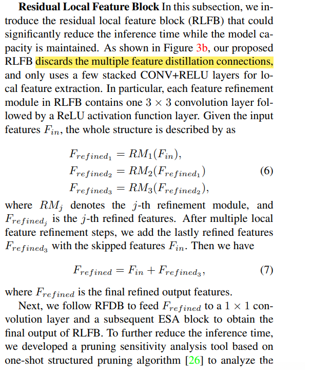 为此,作者复现优秀SR方法RFDN,并且尝试改进,获得更好的重建质量和推理时间。首先,作者重新思考了RFDN残差特征蒸馏网络模块中几个组件的有效性。作者发现尽管特征蒸馏模块极大的减少了参数量,但是这个模块对硬件很不好并且限制了模型的推理速度。为了改进这,作者提出了新的残差局部特征网络。为了进一步提高模型的性能,作者利用了对抗损失。