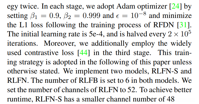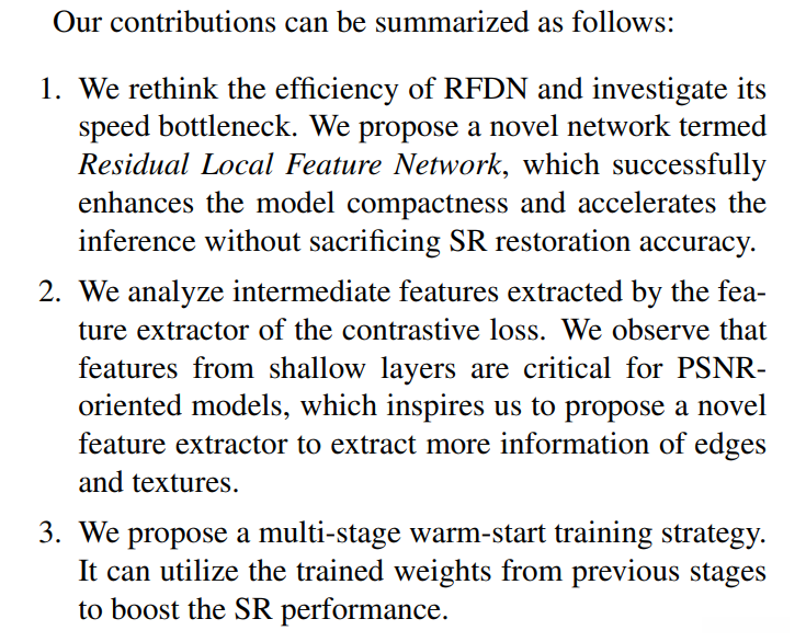 上图介绍了作者了主要贡献。作者是在RFDN的基础上提出了新的网络结构。首先作者思考了RFDN各个模块的有效性。作者提出了RLFN。作者为了使模型的性能更好,作者分析了对抗损失的特征提取器中间特征对模型的影响,得出结论浅层特征更好对于PSNR。作者提出了新的训练策略。