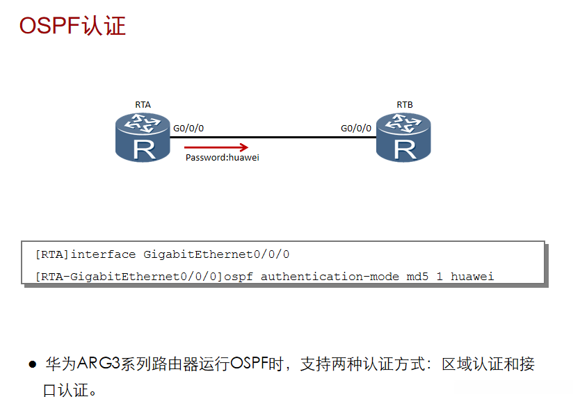 在接口或区域内都可以配置 ospf 的 authentication-mode 命令来实现网络设备之间的安全通信与数据传递的安全性保障功能。该命令支持三种不同的认证方式:一种是 plain(明文密码)模式;另一种是 cipher(密钥交换)模式;第三种则是 null(无认证)模式。其中 plain 用于指定明文密码;cipher 则用于密钥交换;null 则表示不进行认证。